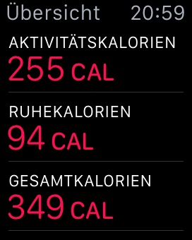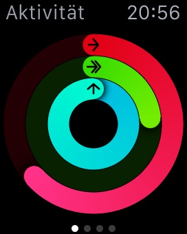 Wie bei anderen Activity Trackern zeigt die Uhr neben diesen drei Ringen auch noch Aktivitätskalorien, Schrittanzahl und Gesamtstrecke an, die du am jeweiligen Tag gesammelt hast.