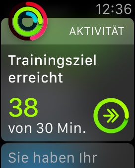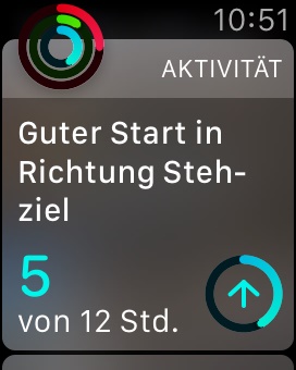 In der letzten Woche gab es das erste Update für die Watch, bei dem unter anderem auch die Messung dieser Daten korrigiert wurde. Bei mir merke ich, dass ich dadurch meine Ziele in Bewegung und Training deutlich schwieriger erreiche. Früher habe ich die Ringe in meinem ganz normalen Tagesablauf füllen können, jetzt muss ich mich dafür wirklich bewegen und trainieren. Recht einfach zu füllen ist der Kreis fürs Stehen. Die Watch motiviert dich, jede Stunde für eine Minute aufzustehen. Gerade wenn man einen Bürojob hat kann es schnell mal passieren, dass man unbemerkt ein paar Stunden auf seinem Bürostuhl festhängt. Damit dies nicht mehr passiert, tippt die Apple Watch dir mit ihrem Vibrationsmotor leicht auf den Arm, um dich daran zu erinnern, dass es wieder Zeit zum aufstehen ist! Eine ganz tolle Funktion übrigens auch für lange Autofahrten!